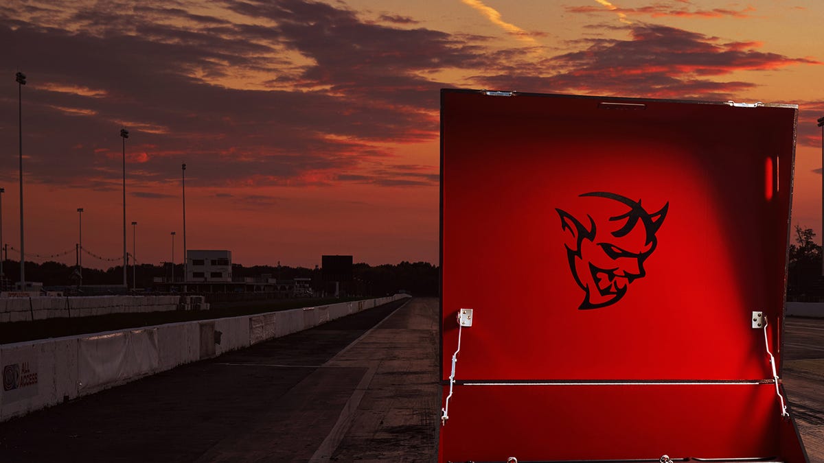 Dodge won't give out specifics just yet, but it claims the crate will contain 18 parts that prepare the car for the drag strip. It includes performance parts, track tools, spare wheels and something called the "Demon Track Pack System," which sounds menacing. It probably won't contain wheelie bars and a drag chute, but it's likely to boost the Demon's drag performance in a big way. And it looks like at least two of those tires will be skinnier, which will help its straight-line strip performance.