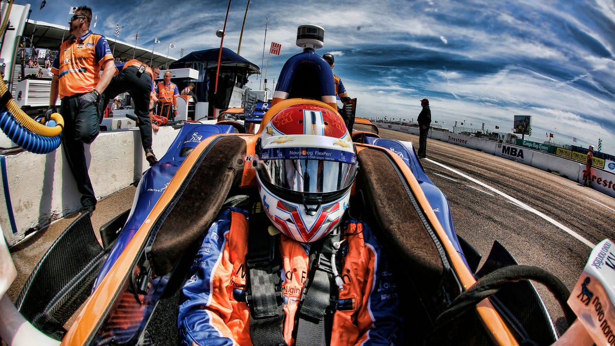 Just before hitting a sharp turn at 190 miles per hour, IndyCar driver Charlie Kimball quickly checks his dashboard.