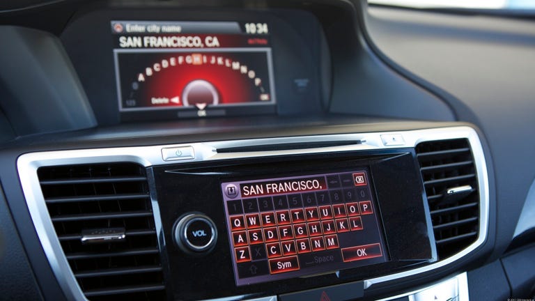 In our navigation-equipped Accord Coupe, the infotainment system actually consists of two color LCDs and two different control schemes that work together. The main screen is standard to all Accord models and is an 8-inch display that sits at the top of the dashboard outside of the driver's reach. It's not touch sensitive and is controlled by a large control knob located low on the center stack, which is an odd placement. It's not as easily reachable as the center console placement that the German manufacturers have favored recently, not as visible as the high placement favored by Nissan/Infiniti, and requires a bit of reaching around the shift knob depending on the chosen gear.