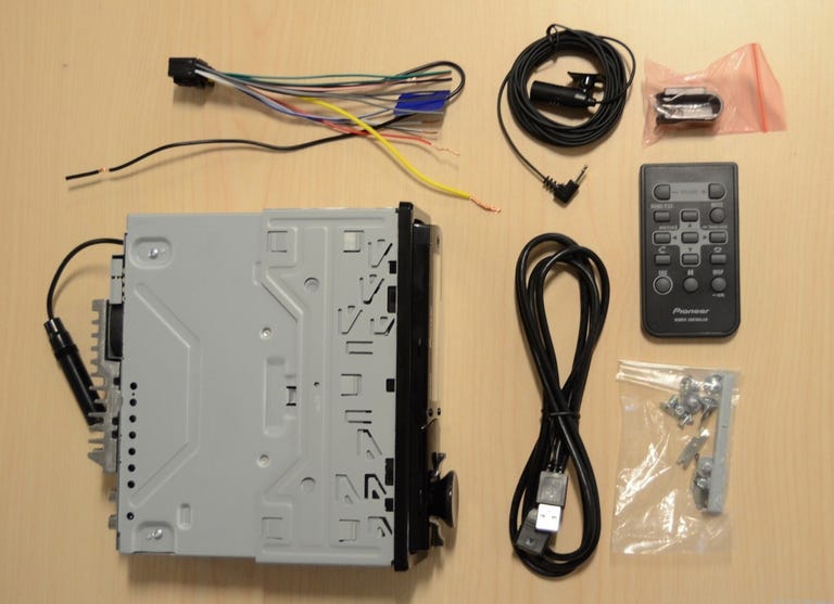 The DEH-X9500BHS CD receiver comes with a remote control, a USB extension cable, a microphone for hands-free calling, a wiring harness, and an assortment of screws.
