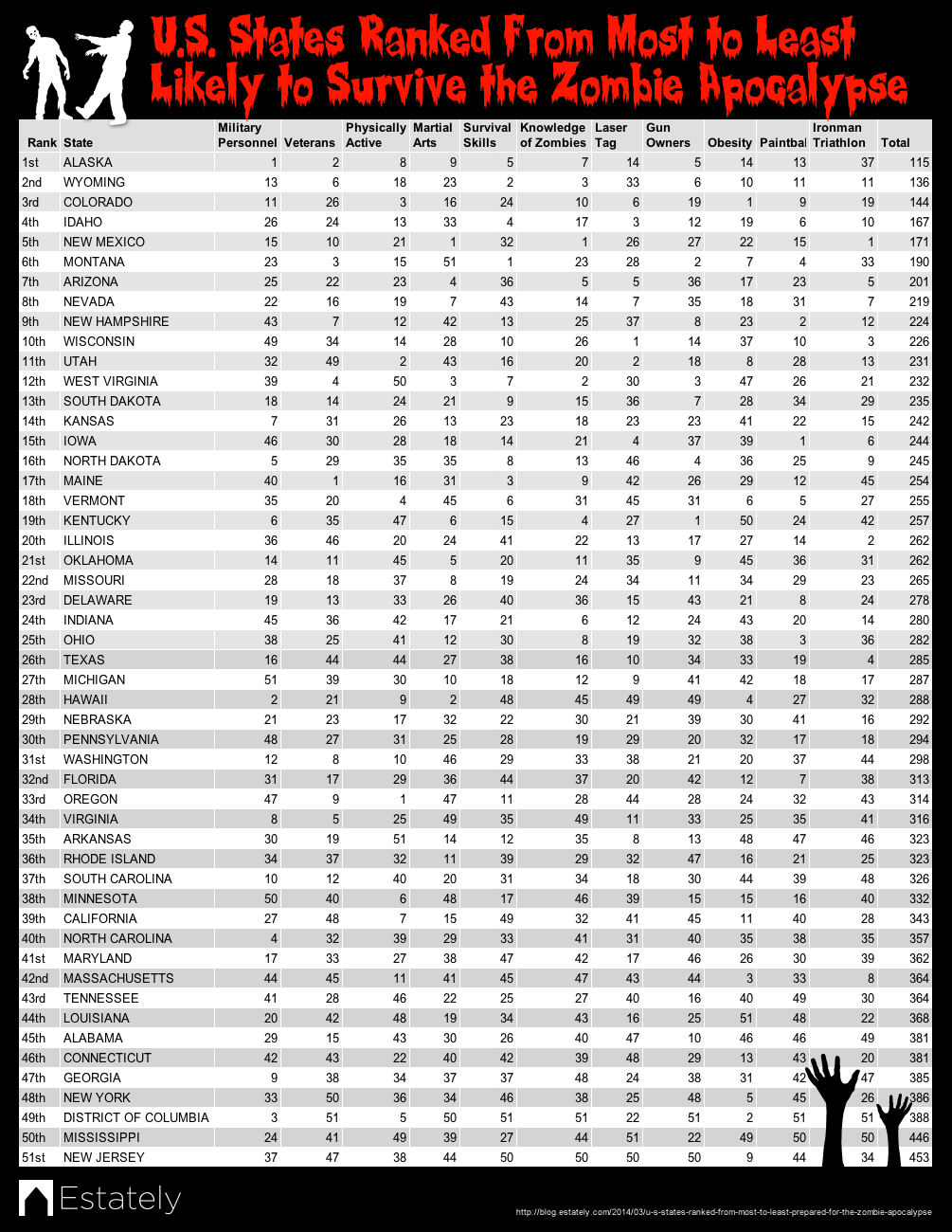 That's because, according to a new ranking by real estate site Estately, Jersey is the least likely state in America to survive an zombie apocalypse, followed by Mississippi and Washington, D.C. The safest places to be when the zombies arrive? Alaska, followed by Wyoming and Colorado.