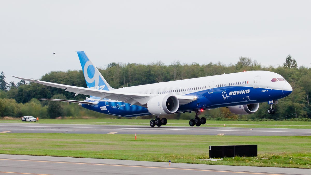 Boeing's 787-9 Dreamliner, a larger version of the company's original 787-8 jetliner, made its first test flight Tuesday.