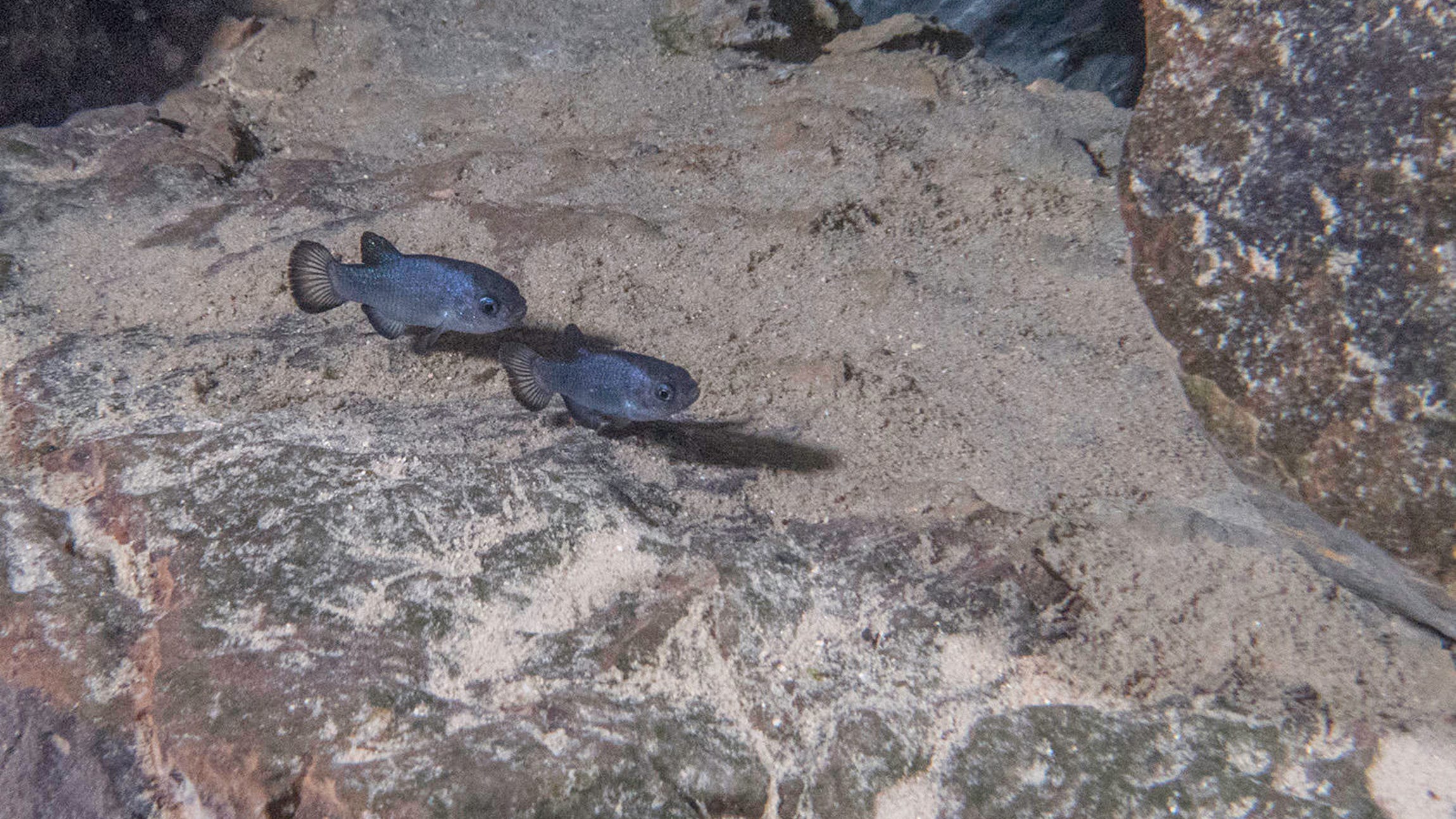 In addition to rattlesnakes and a thriving killer bee population — "Are either of you allergic to bees?" Wilson asks — Devils Hole is home to an endemic and endangered species of fish called the Devils Hole pupfish: a tiny silvery-blue fish, just 1 to 3 inches long, that got its name because of the way they frolic like puppies.