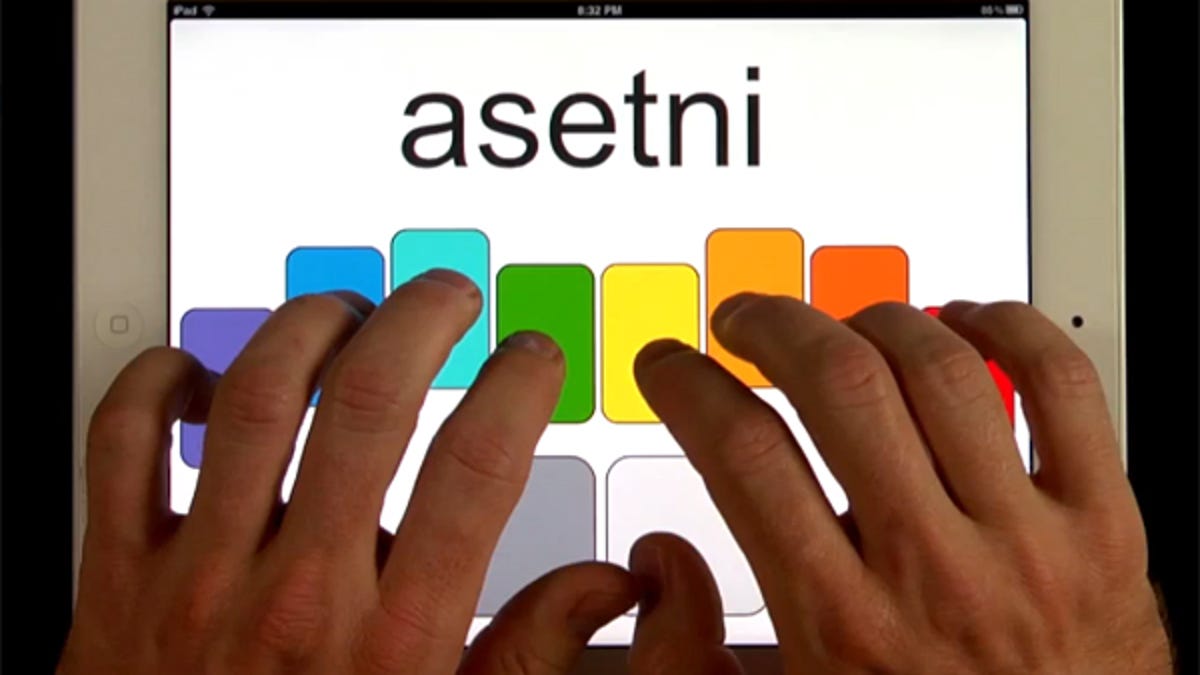Pointesa hopes so. The software developer has come up with an all-new typing system optimised for tablets that uses just 10 keys. It's called ASETNIOP, after the eight base letter keys (the other two are Shift and Space), and all other letters, numbers and punctuation marks can be typed by pressing two or more keys simultaneously.