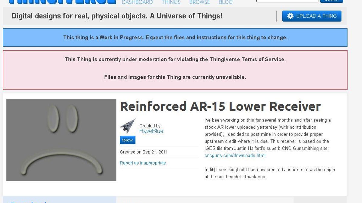 As of a day ago, MakerBot's Thingiverse Web site hosted the plans for a key component of an AR15 semi automatic rifle. Anyone could download Michael "HaveBlue" Guslick's design for the lower receiver, and if you had a 3D printer you make one yourself.