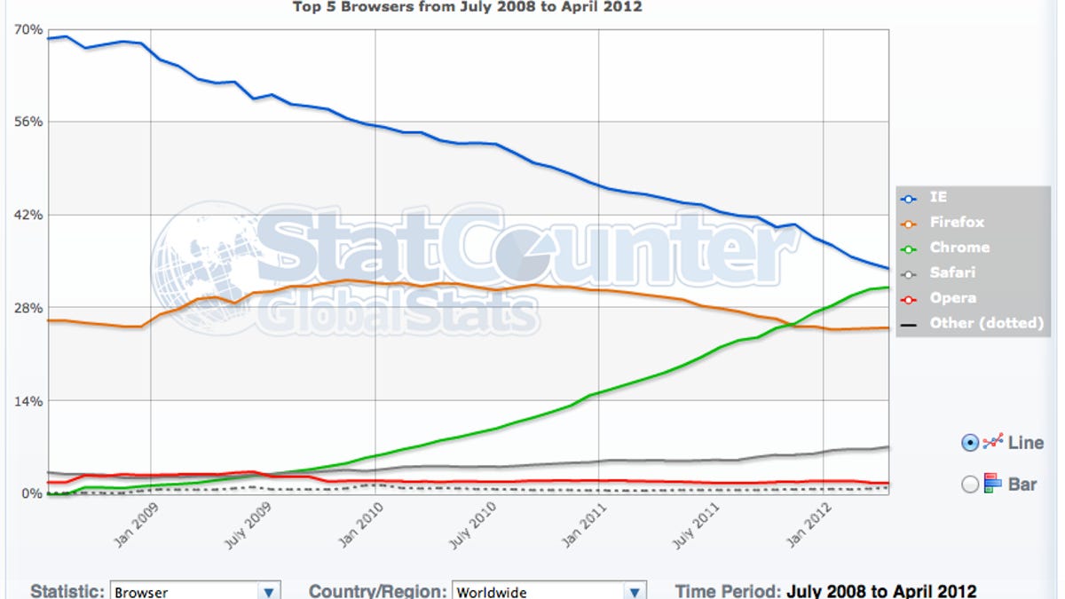 In July 2008, IE controlled 68.5 percent of the market, according to Statcounter, while Chrome wasn't even on the market. Now Microsoft's browser is down to 34.8 percent market share while Chrome controls 30.9 percent of total browser usage. Chrome has grown by a percentage point the last few months, while IE has dropped by around the same amount.