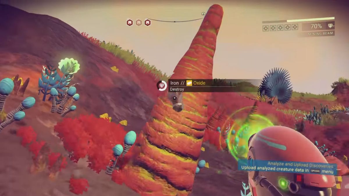 An easy way to make some spending money in No Man's Sky is to use the Analysis Visor to log new discoveries. Animals, plants, planets and new planet systems can all be logged. But simply logging these items doesn't earn a large paycheck -- just a few hundred units per item. To earn more, open the settings menu and upload each of your discoveries to receive some units in return.