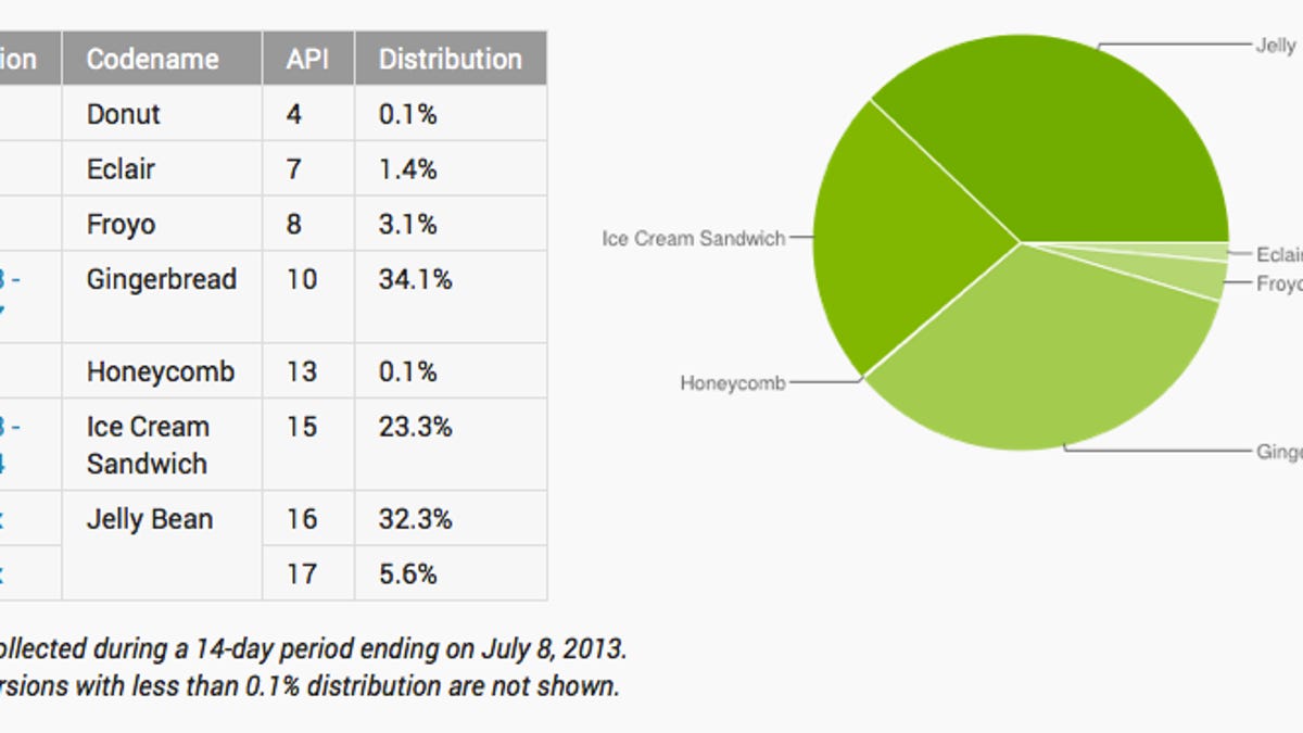 This is an increase of 4.9 percentage points for Jelly Bean since last month. In June, Jelly Bean had 33 percent usage and Gingerbread had 36.5 percent. The new data reflects usage from the 14-day period ending on July 8.