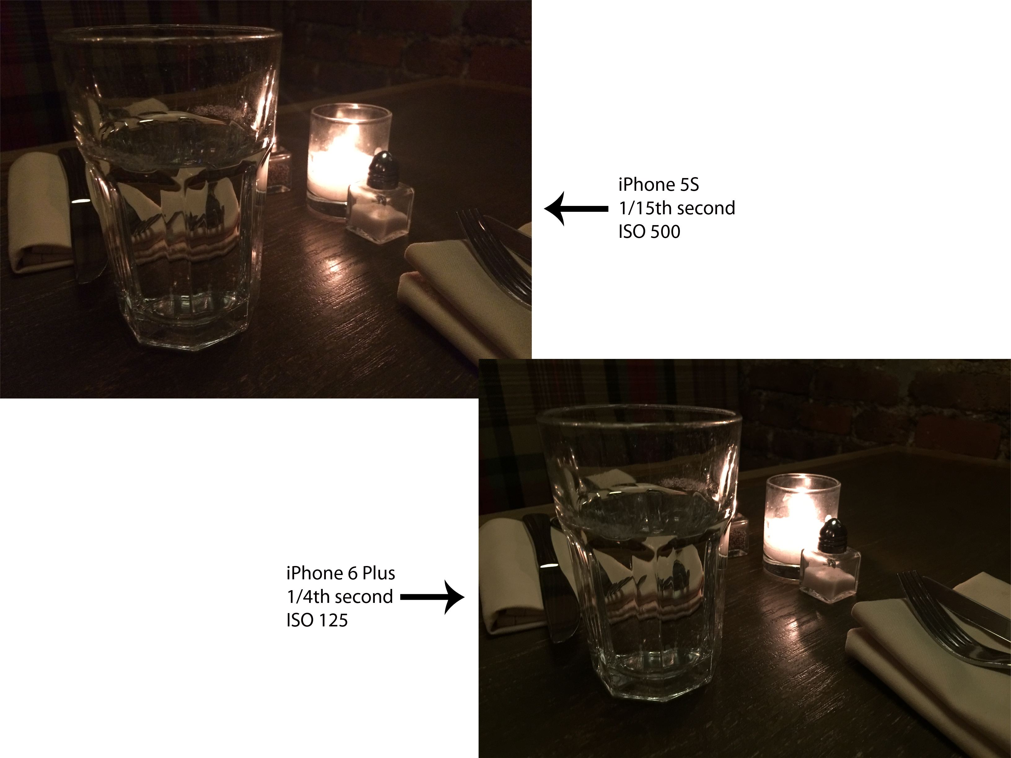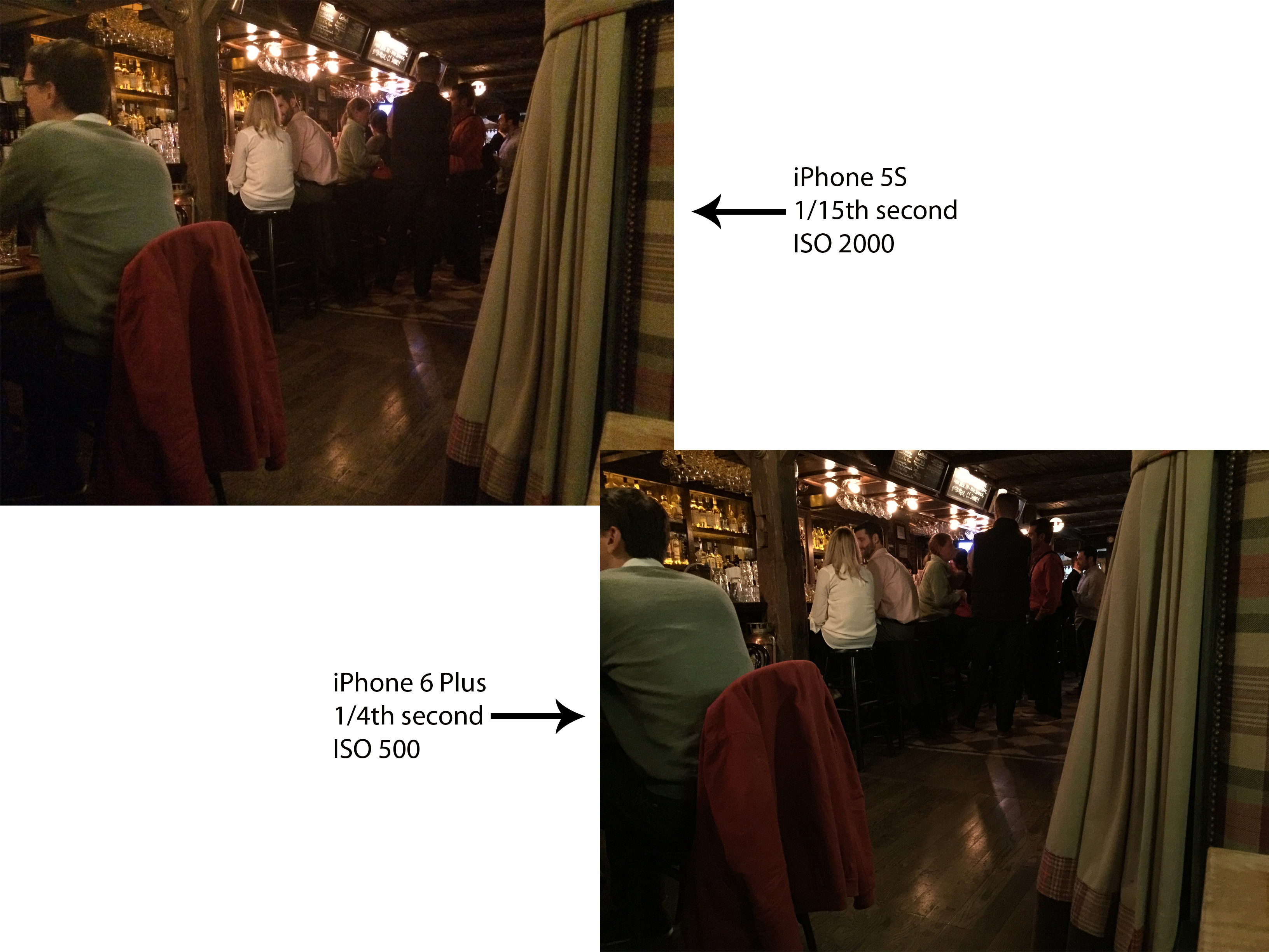 With the 6, you do get improved low-light photo quality in part to Apple taking advantage of its new sensor and processor. Just like past iPhones used to do for HDR pictures, the new phones in dim conditions will quickly shoot multiple photos and stack them, in the process removing minor blur from hand shake as well as noise (a technique Sony and others have been doing for years in their point-and-shoot cameras).