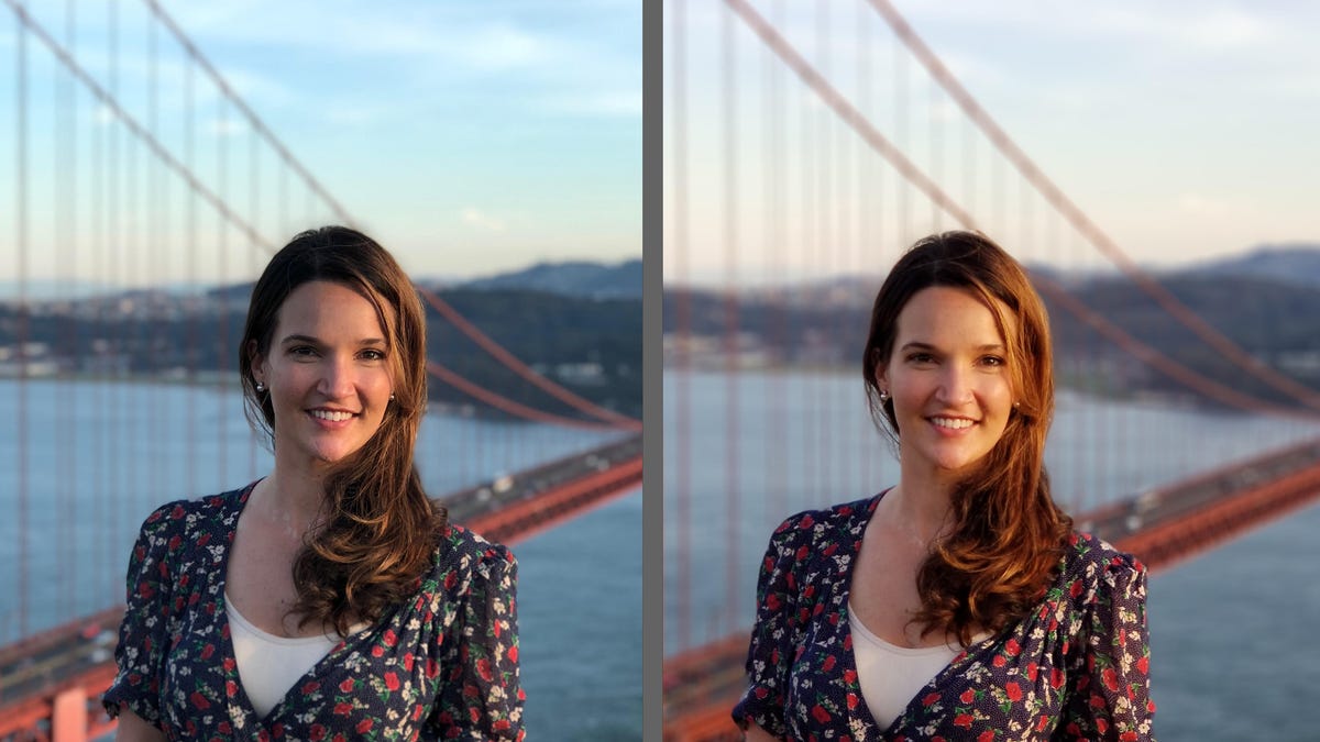 The one shot on the iPhone has greater contrast and richer colors, but Taylor's face looks darker. The phone also had a hard time figuring out the edges of her hair and the blurred background effect looks harsh around her face.