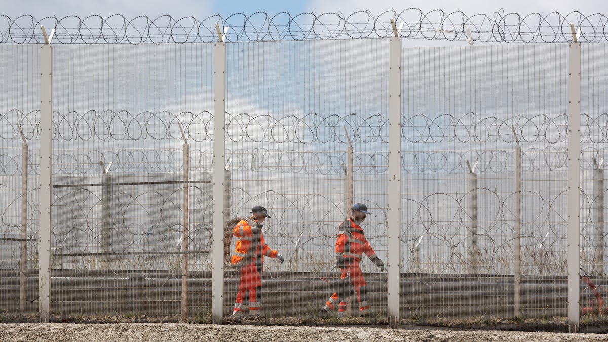 Bordering the edge of the camp is a strip of sand a few hundred yards wide leading up to a high bank topped with fences. Orange-jacketed workers walk between two layers of fencing, unspooling hoops of razor wire. Armed police officers walk with them, eyeing us balefully as Stephen climbs the bank to take photographs.