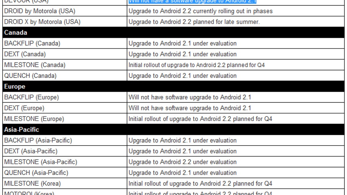 In terms of downright disappointing news, we've learned that the Devour will not see any future updates. What's more, the European Backflip and Dext also are staying put with their current versions of the OS. Much like Samsung's Behold II, these phones will head off into the sunset with Android 1.6 "Donut." At one point, however, they were listed as "upgrade under evaluation." Unfortunately, that doesn't bode well for the Asia-Pacific and Canadian versions of the phone, which carry that status today. I wouldn't hold my breath for a 2.1 update.