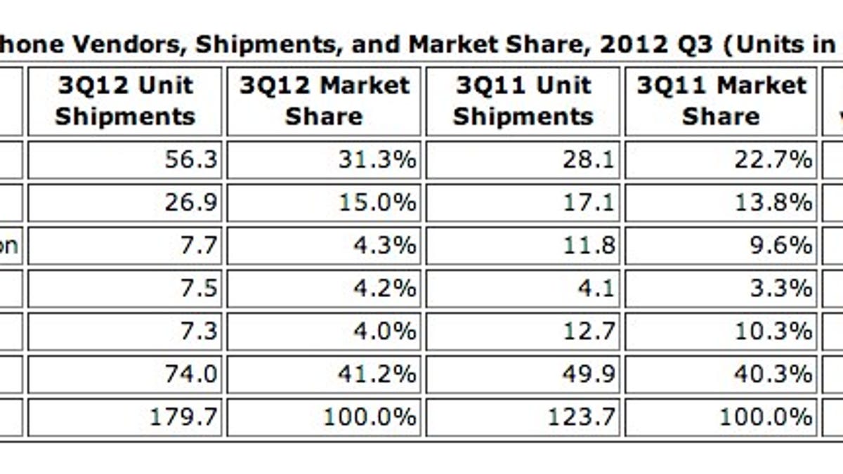 All told, 179.7 million smartphones shipped last quarter, representing a whopping 45 percent gain over the prior year. Total mobile handset shipments reached 444.5 million last quarter, up just 2.4 percent compared to the 434.1 million shipped in 2011.