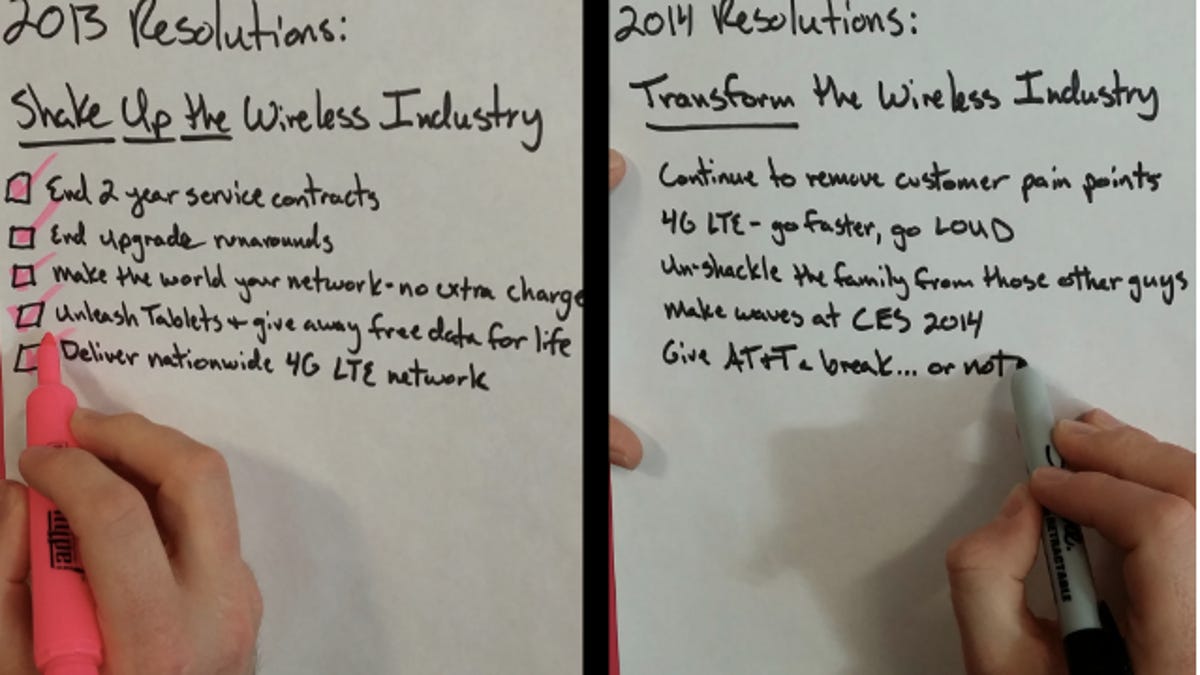 As for the 2014 resolutions, Legere didn't offer specific details. He reiterated the company's mantra of shaking up the wireless industry by eliminating "customer pain points." He joked about letting up on his jibes against AT&T. And he noted that the company will continue to push forward with its 4G LTE network.
