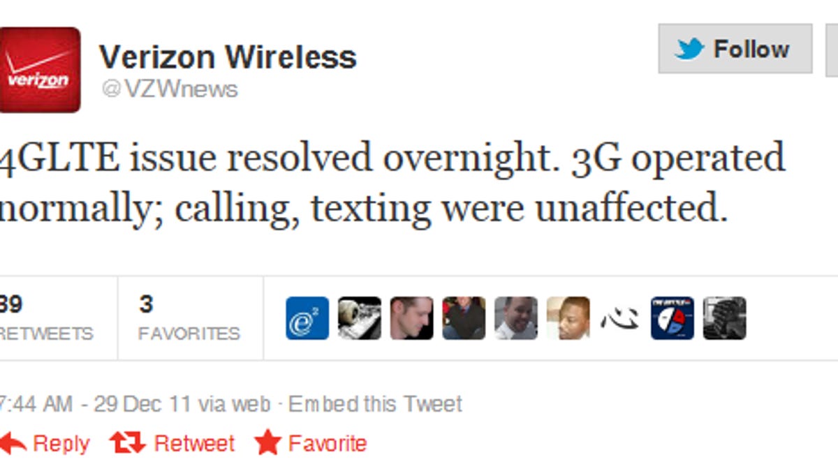 In tweeting the news, Verizon Wireless said that the 4G LTE issue was resolved overnight. 3G connectivity, as well as calling and texting, had been unaffected, the company added.