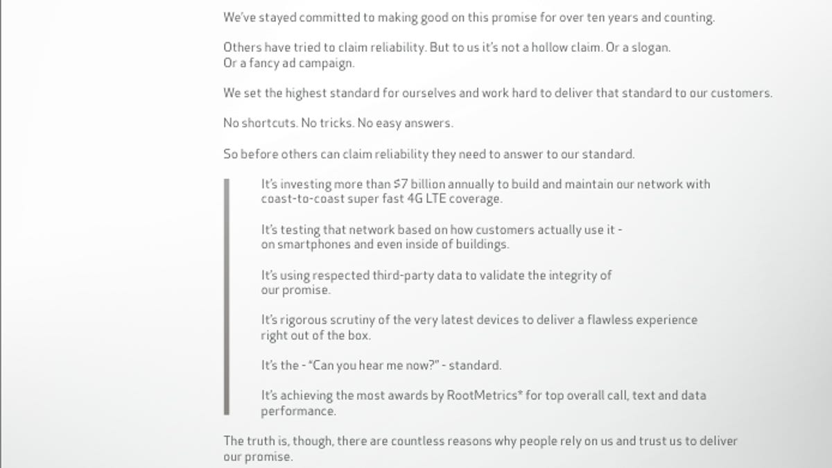 Verizon's response touted its $7 billion annual investment in its network, its testing, and its "rigorous scrutiny" of new devices, as well as third-party data including RootMetrics' call, text, and data performance.