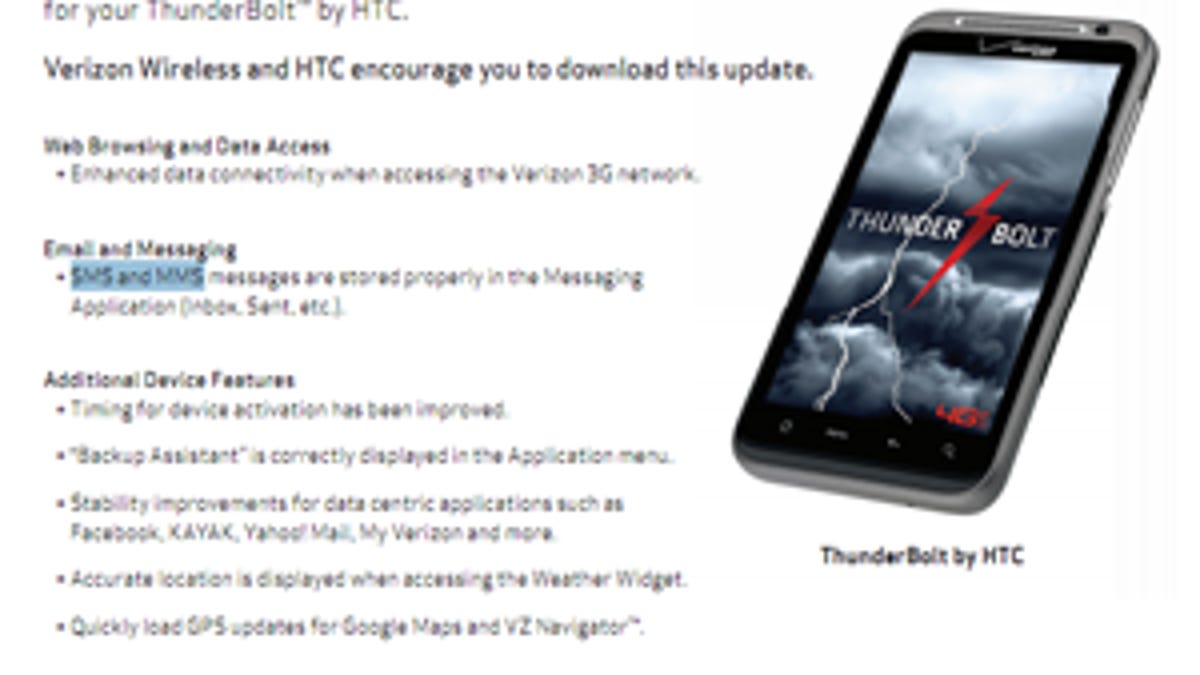 Verizon Wireless's first 4G LTE handset, the HTC Thunderbolt, is set to receive its first software update. And while it's not a major update such as Gingerbread, it should be enough to satisfy most users.