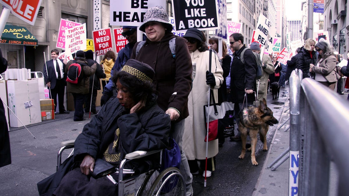 Groups advocating for the blind and reading disabled on Tuesday held a protest at the Manhattan offices of the Authors Guild. The guild was very vocal in opposing the text-to-speech technology in the Kindle. The group, which represents 4,000 authors, argued that the Kindle infringes on copyright and could hurt audio book sales.