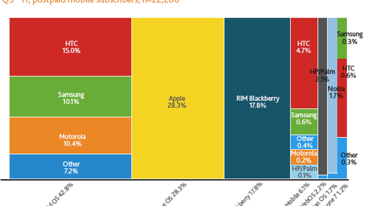 HP's Palm and WebOS grabbed 2.2 percent, leaving Nokia's Symbian with just 1.7 percent, both down slightly from their shares in the March to May period.