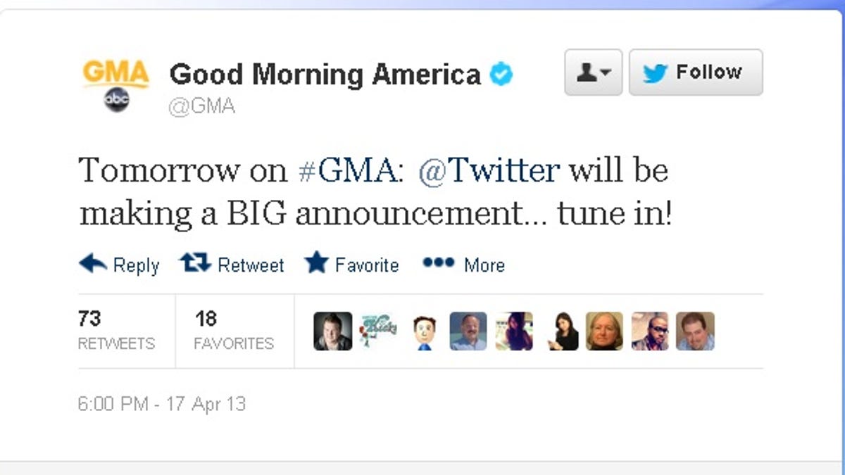 The microblogging site will be making a "BIG" announcement during Thursday's broadcast of "Good Morning America," according to a tweet on the show's twitter feed. No stranger to morning TV show's audiences, Twitter went on "Good Morning America" last year to announce a refresh of its profile page design.