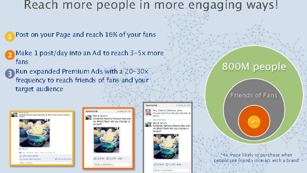 The social network promises advertisers that the new ads will be in a larger format, boosting engagement by 40 percent and increasing retention by 80 percent. Fan rates are also expected to increase 16 percent, as well as purchase intent, according to the documents, which appear to be a presentation prepared for Facebook advertisers.