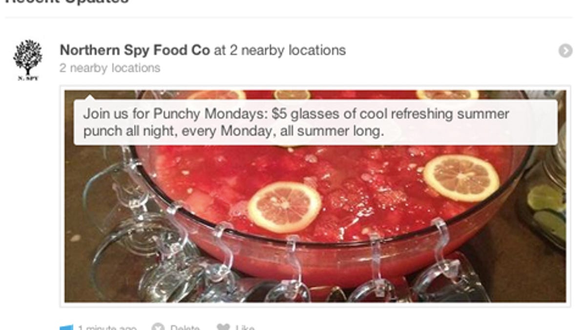 The new feature, called Local Updates, began rolling out today, providing what is essentially a status update for the nearly 1 million merchants who have claimed venues on the social service. The free-to-use service allows merchants to post text messages, special promotions, and photos to the Foursquare activity feeds of loyal patrons who are in the vicinity.