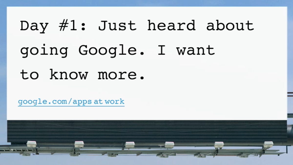 Commuters in New York, Boston, Chicago, and San Francisco will be greeted by a progressive series of ads for Google Apps starting Monday and running for a month. The idea is to catch IT managers stuck in horrific traffic spots like New York's West Side Highway or San Francisco's U.S. 101 and press them on the benefits of switching to Google Apps with a different ad for each day of the week.