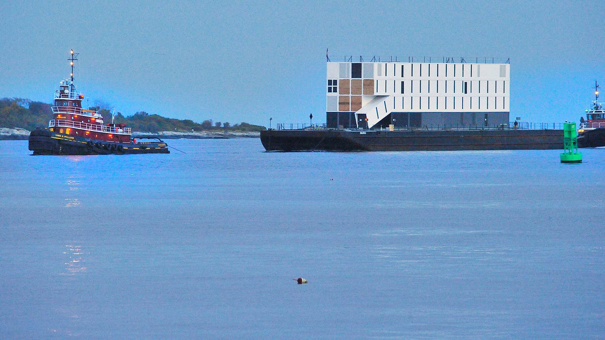 In both cases, the structures on both barges appear to be made from a number of shipping containers, many of which have small slats for windows, and each has one container that slants down to ground level at a 45-degree angle.