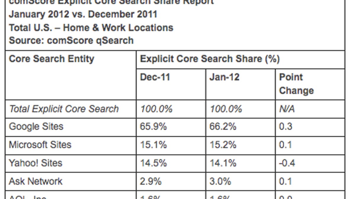 Google's "powered by" searches, which include those at its own sites along with Google-branded searches at AOL and Ask, seized 68.4 percent of all organic searches--up from 68.1 percent in December. Microsoft's "powered by" searches, which cover those at Bing and Yahoo, captured 26.5 percent of all organic searches with no change from December.