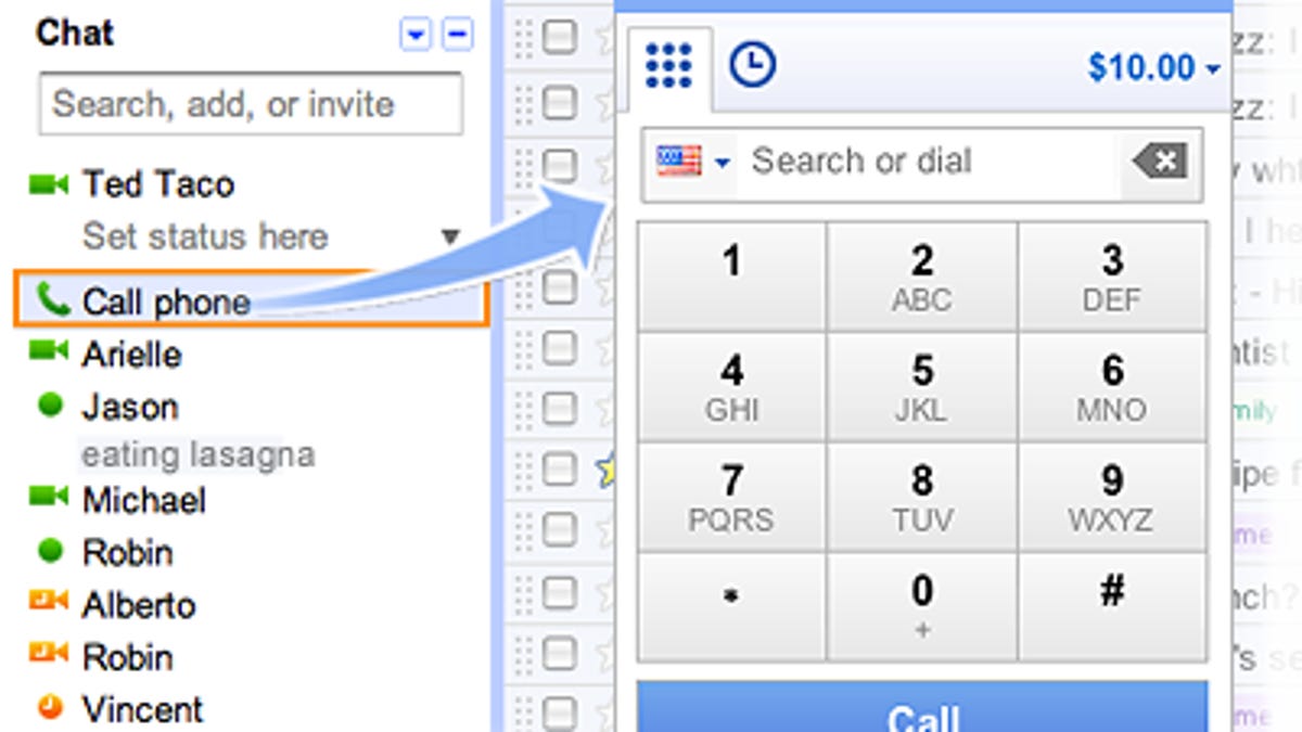 Launched in the summer of 2010 as an alternative to Skype, Google's calling plugin lets people make calls to any mobile phone or landline via the Chat section in Gmail. The service is available for a slew of countries (there's a list here, under "show all rates").