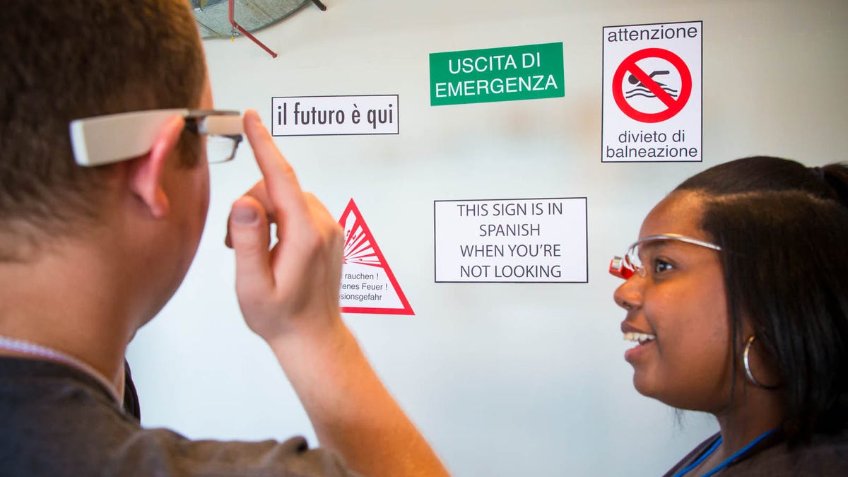 The app can take a German warning sign such as, "Bergweg betreten auf eigene Gefahr," and replace the printed words with, "Mountain path enter on own danger," when looking through Glass.