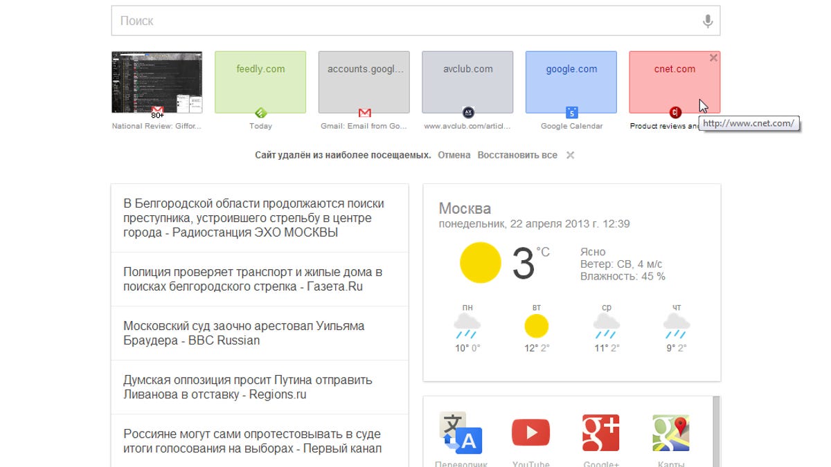 There are other indications that big plans are afoot for Google Now. Along with the call-outs hidden in the test page's HTML, Google has built a Chrome desktop extension that opens Google Now as your "new tab" page. Its default language is set to Russian, but it is verified in the Chrome Web Store as coming from Google.