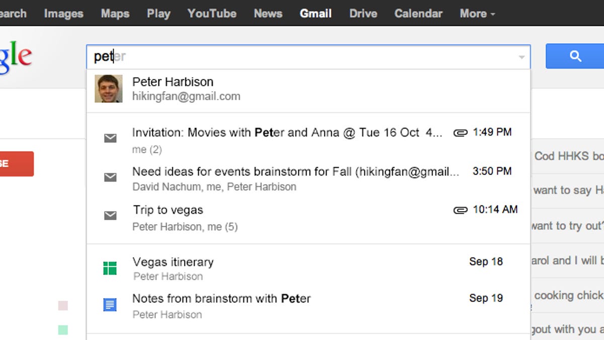 Participants in the trial will first notice a kind of instant-search feel to Gmail search results, as relevant e-mails will begin popping up in the search bar as soon as users start typing. And it won't only be e-mail: The trial lets users search Google Drive and Google Calendar as well.