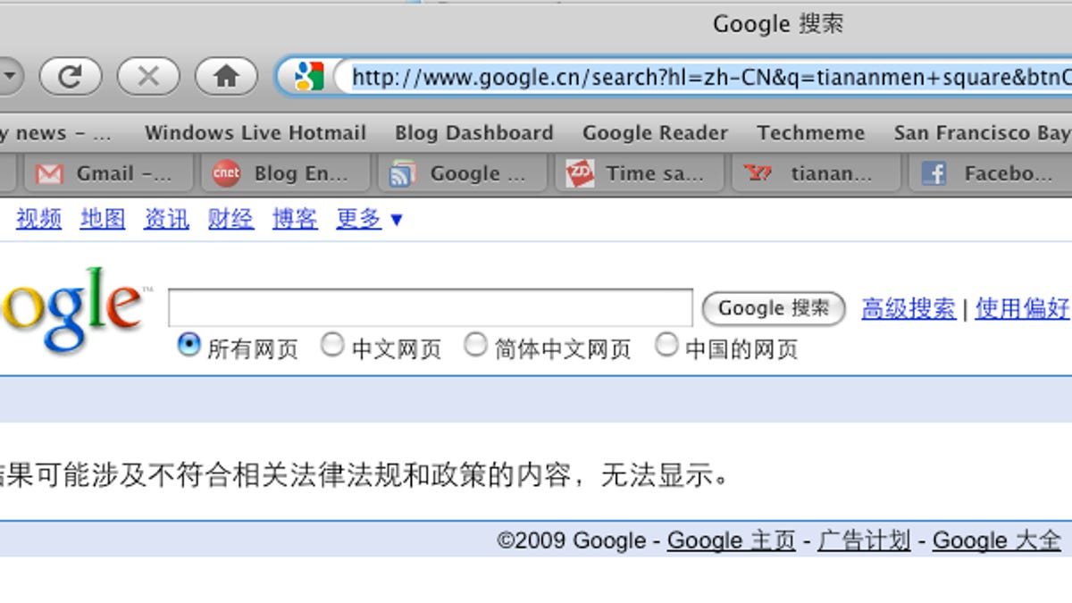 For about eight days between June 3 and June 11, Google.cn blocked all results that might come from searches for Beijing's Tiananmen Square. Not just politically sensitive results, not just historical accounts of the hundreds of deaths on June 4, 1989, but every single result--including directions to the square--with an error message that read "Search results can not be displayed as they may contain contents that do not comply to related laws and policy."