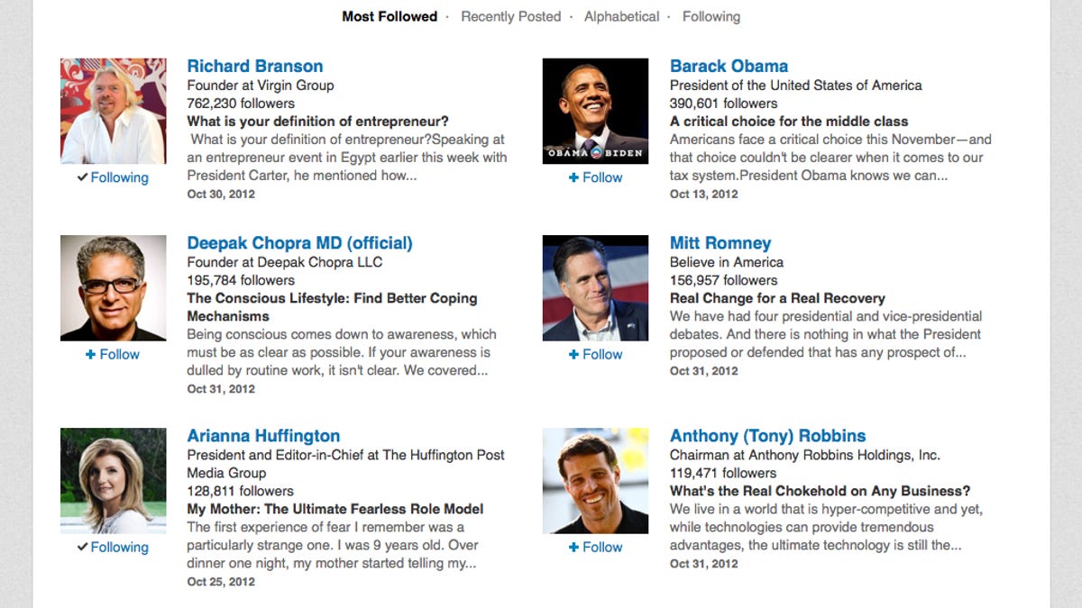 What has LinkedIn learned from its users in the last month? They love Virgin CEO Richard Branson, who has almost a million followers reading his thoughts on running a multinational corporation.