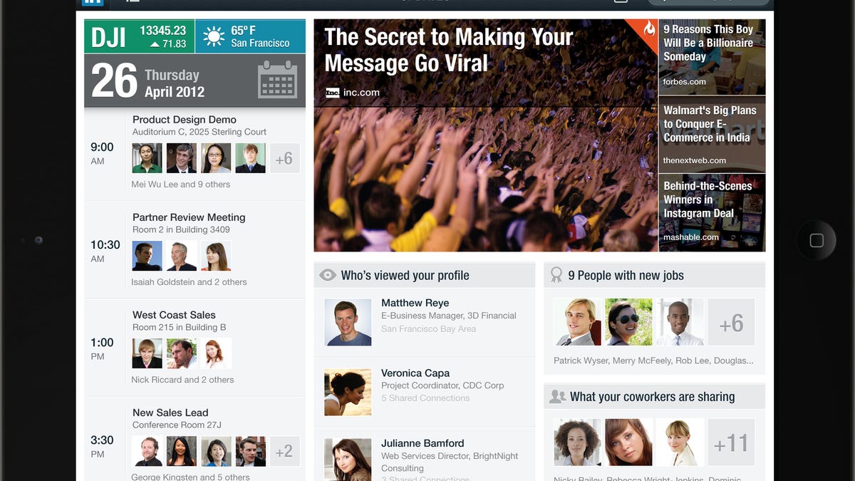 An iPhone app launched last year shows you what your contacts tell LinkedIn they're reading. Today the company is launching an iPad app (and updating its other mobile apps) that does even more. In particular, it displays calendar data, which it gets from your mobile device, and merges it with information about the people you're meeting with, which it gets from LinkedIn and Twitter, to give you useful information about them ahead of time.