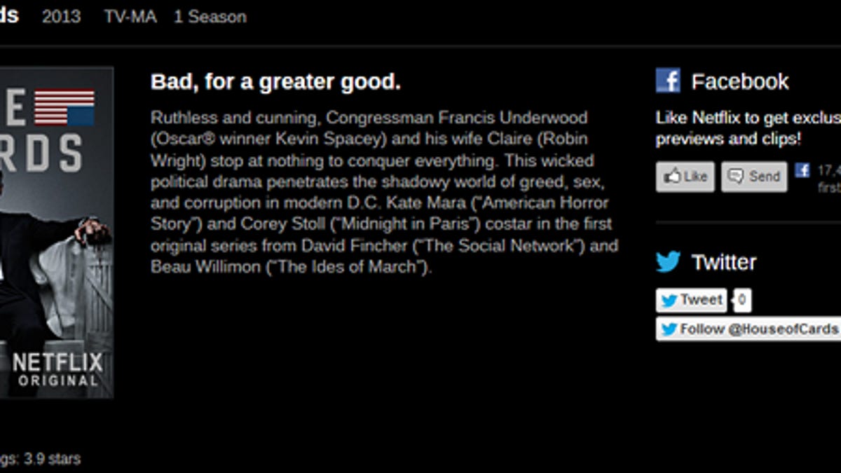 Based on a BBC miniseries, "House of Cards" is a drama that takes place in the political underbelly of Washington, D.C., with all the elements designed to lure viewers -- sex, greed, and corruption. The series stars Kevin Spacey as a Washington congressmen with Robin Wright as his wife. They will "stop at nothing to conquer everything," according to the show's description.