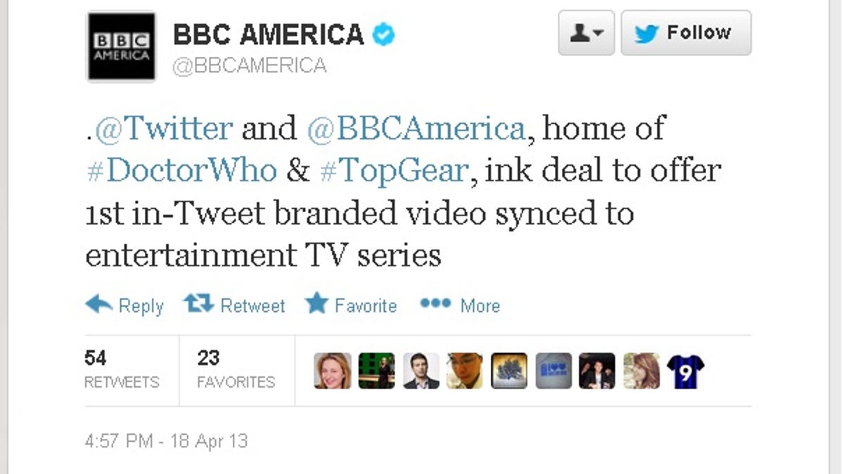 The microblogging site has partnered with BBC America to offer what the network trumpets as the first "in-tweet branded video synced to entertainment TV series," according to a tweet sent Thursday evening. What this means exactly is not clear. Presumably, the tweeted video would be companion content to the programming that appears on the network, with the partners driving traffic to each other.