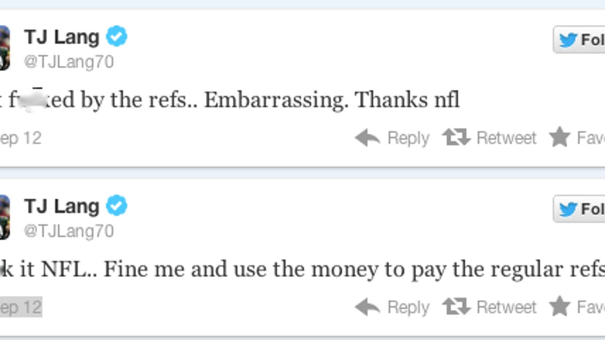 Lang's two tweets, one which read "Got f---ed by the refs.. Embarrassing. Thanks nfl," and the other, "F--k it NFL. Fine me and use the money to pay the regular refs," were pure frustration at having lost the game to the Seattle Seahawks, likely due to a missed call by referees standing in for locked out NFL officials. And, as CNET blogger Chris Matyszczyk wrote, Lang was hardly alone among NFL players in expressing his feelings on the situation.