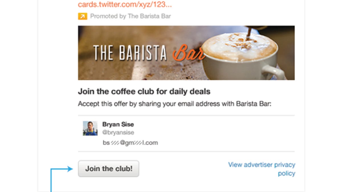 With the new card, advertisers can entice Twitter users to sign up for offers through expanded tweets. People need only click a single button to accept an offer and share their e-mail address directly with an advertiser. Twitter said the process is secure.