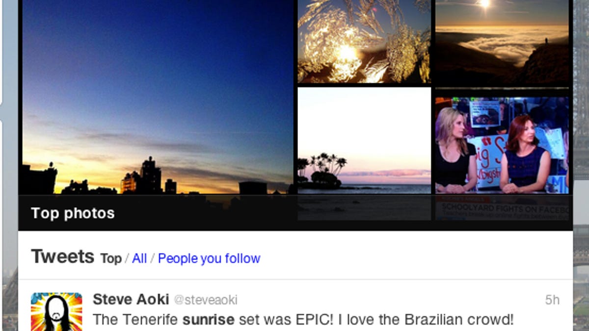 The most interesting new feature is one that adds a palette of "top" photos and videos to search results. So, for example, if you search for "sunrise," you see a group of photos above the resulting column of tweets, as well as a row of video thumbnails off to the side.