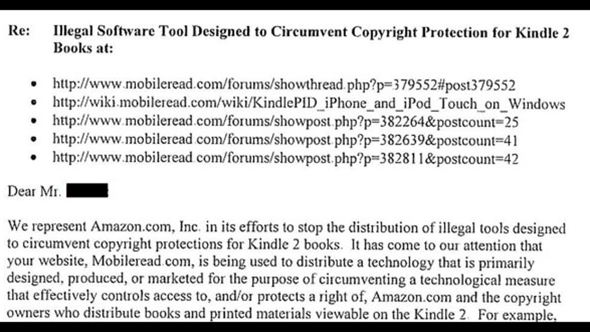 Amazon sent a legal notice to MobileRead.com complaining that information relating to a computer utility written in the Python programming language "constitutes a violation" of the DMCA, according to a copy of the warning letter that the site posted. MobileRead.com is an e-book news and community site.
