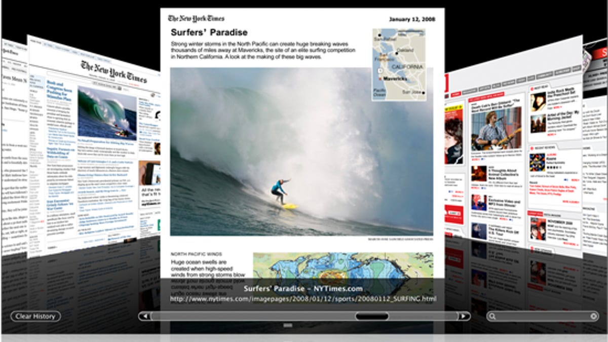 The company said the newest edition of Apple's browser for both Mac OS X and Windows will run JavaScript commands 4.2 times faster than Safari 3, and also claims to deliver better JavaScript and HTML page loading than Microsoft's Internet Explorer 7 or Mozilla's FireFox 3. Apple also added the Cover Flow interface now found in almost every piece of its software to let users scroll backwards through browsing history as if they were flipping through album covers, and what appears to be Apple's own implementation of FireFox's Smart Location "awesome bar" called Smart Address Field.