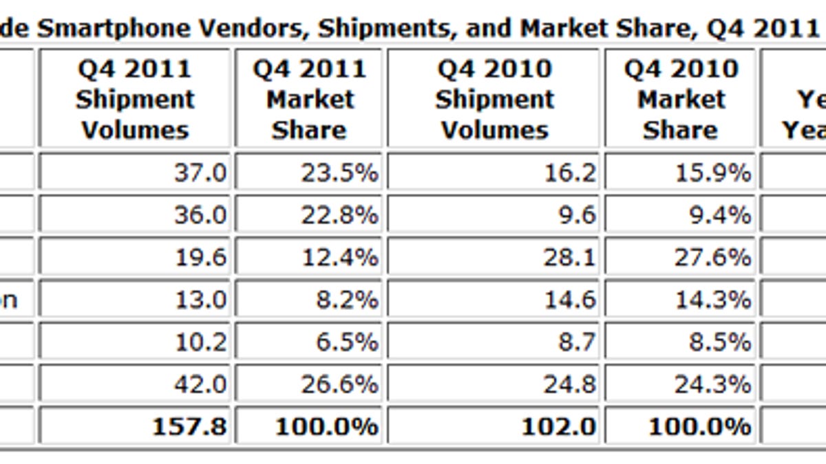 Looking at the full year, Samsung actually emerged as the top smartphone maker over Apple, though just by a fraction. Samsung's market share for 2011 rose to 19.1 percent from 7.5 percent in 2010, according to IDC, while Apple's nestled in at 19 percent last year from 15.6 percent in 2010.