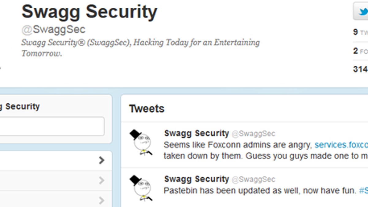A group of hackers known as Swagg Security is taking credit for a breach of Foxconn network security, resulting in the theft of usernames, passwords, and other private information.