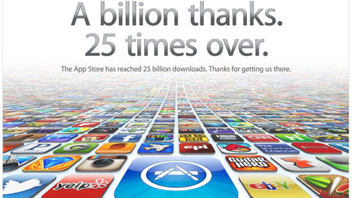 The iPhone and iPad maker's main Web site was festooned with a banner trumpeting the milestone, but the 25 billionth downloader--and consequent contest winner--has not yet been announced. That lucky individual will receive a gift card for the iTunes Store, worth $10,000. (That's a lot of Beatles ring tones.)