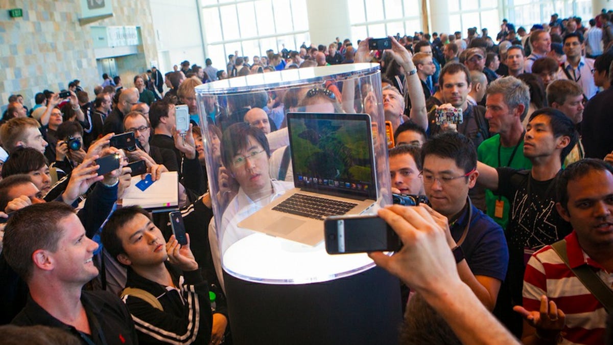 SAN FRANCISCO--The new Retina Display Macbook Pro made its debut at Moscone Center and drew a large crowd of fans, positioning their iPhones to snap pictures of the newest member of the Mac family. It was like a crowd ogling the Hope Diamond under impenetrable plexiglass at the Smithsonian or the stars walking the Hollywood red carpet at the Oscars.