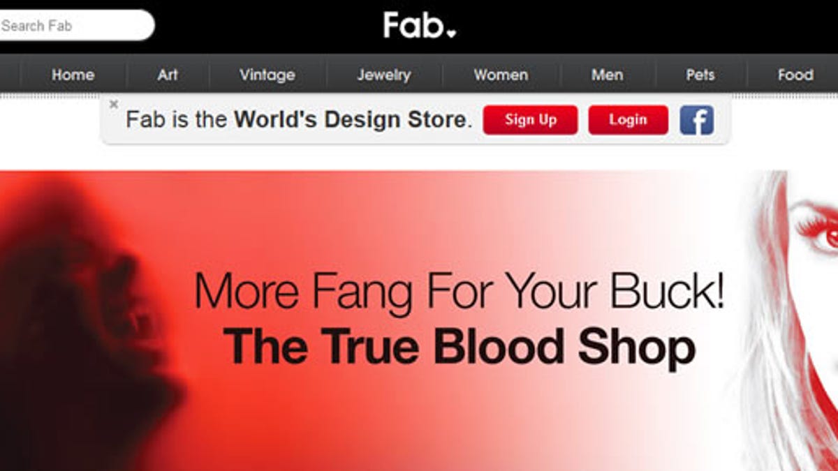 Self-dubbed the world's design store, Fab is an online retailer that sells quirky products, ranging from clothes to jewelry to furniture to food. Its "True Blood" shop, for example, allows fans of the HBO series to buy books, perfume, and even fangs to celebrate the show.