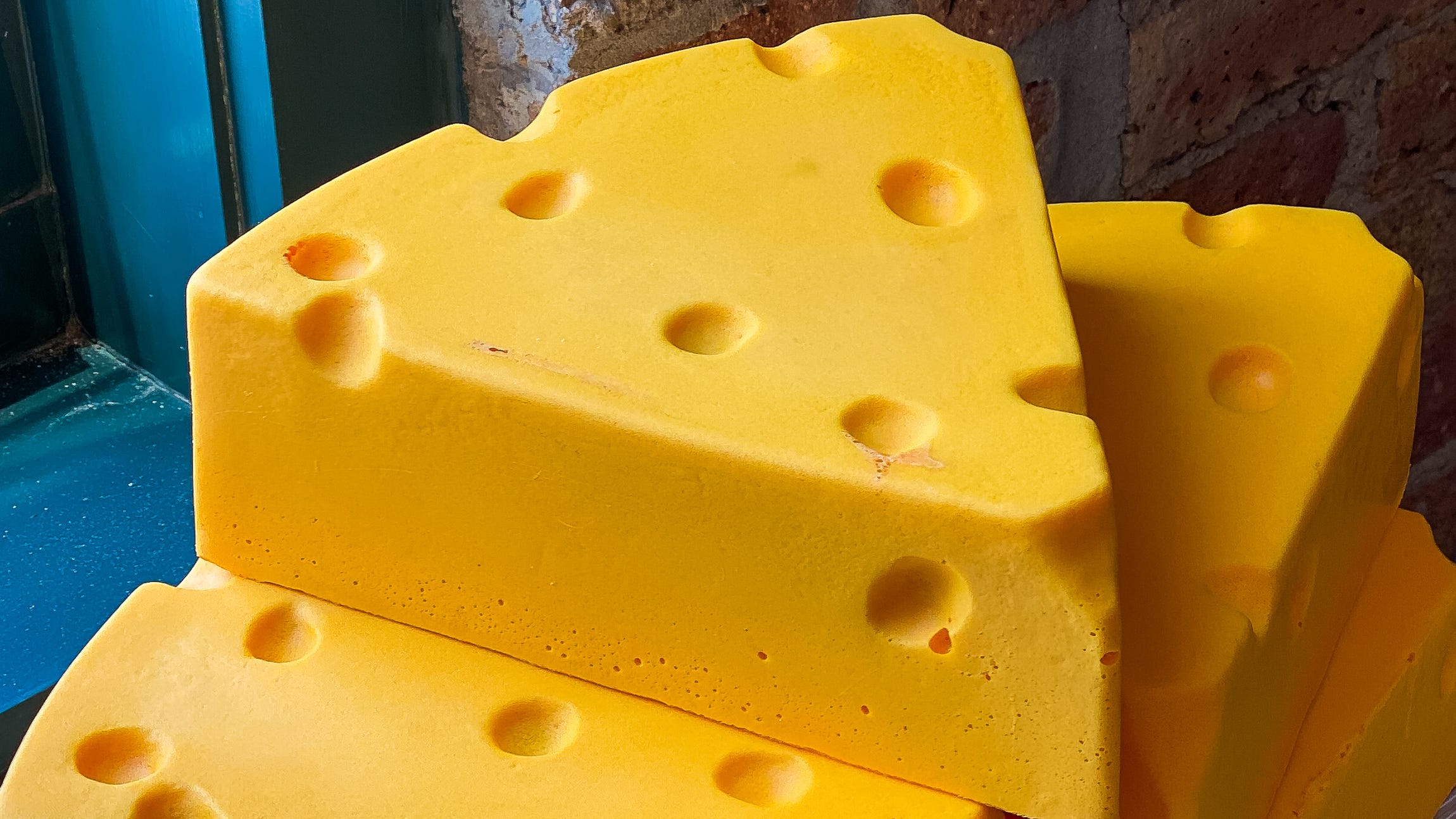 He is hesitant to take credit for much beyond the particulars of the design, which by another happy accident doesn't resemble any real cheese variety and can thus be trademarked. The color resembles cheddar, the shape is more akin to gouda, and the holes (called Schmivitz™, for reasons that have been lost) are inspired by Swiss.