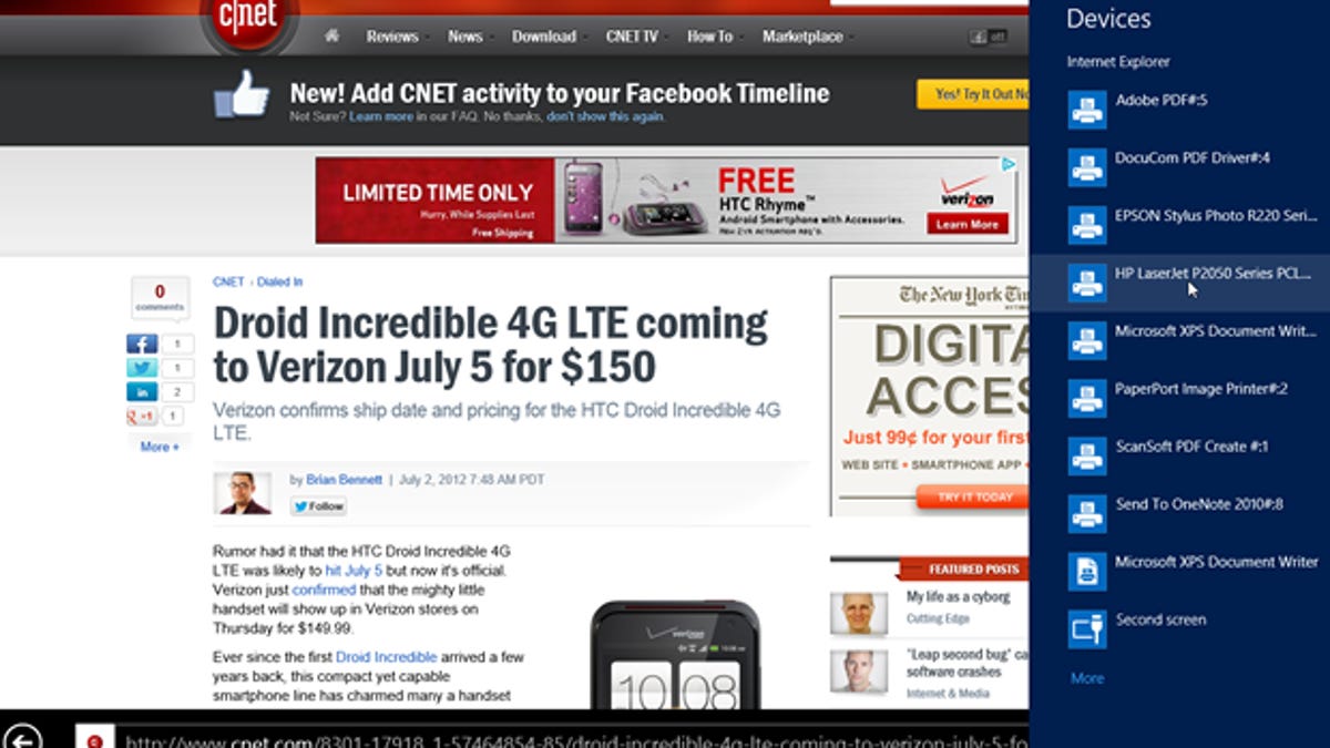 For the Windows 8 Release Preview, Microsoft tweaked the way you print content, at least for Metro apps. Instead of choosing a print command from within the app itself, you print using the Charms bar. Selecting the Device charm provides access to your printer, among other devices. From there you can configure the various settings for your print job.